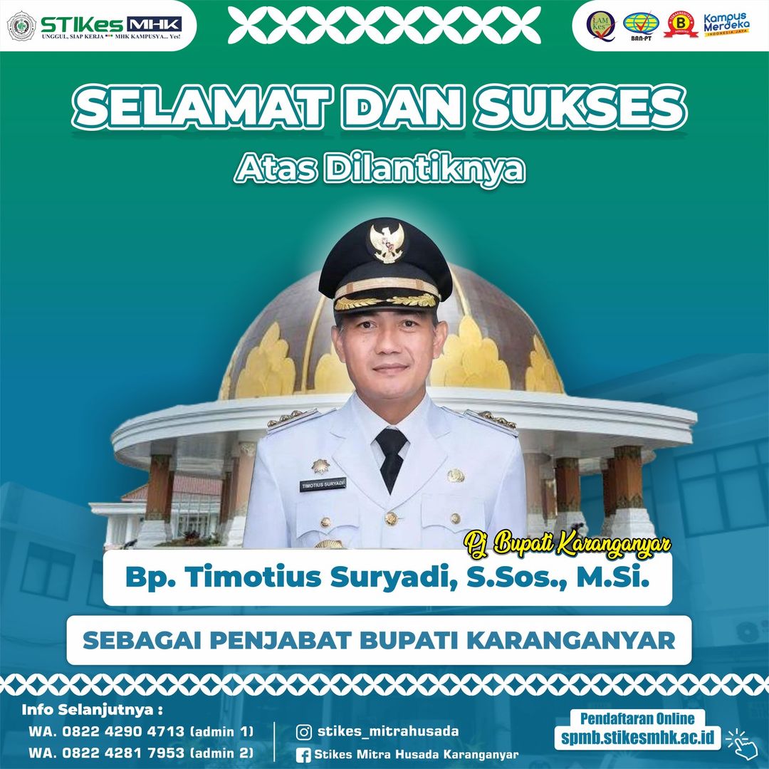 Kami segenap civitas STIKes Mitra Husada Karanganyar mengucapkan Selamat dan Sukses atas Dilantiknya Bp. Timotius Suryadi, S.Sos., M.Si. sebagai Penjabat Bupati Karanganyar. semoga amanah dalam mengemban tugas pemerintahan serta bisa membawa Karanganyar menjadi semakin Hebat!